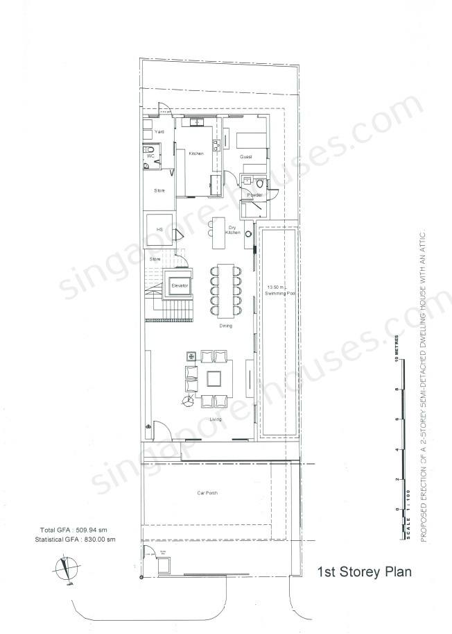 1st Storey: Living, Dining, Dry and Wet kitchen, Guest room, power room, 1 store/utility, bomb shelter, 13.5m swimming pool and a back yard
