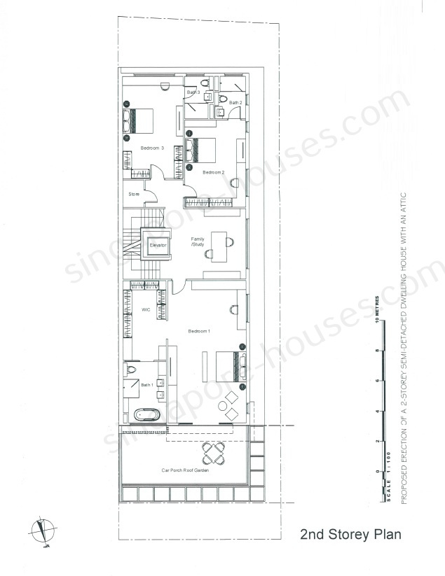 2nd Storey: 3 bedrooms ensuite, 1 family/study area, 1 store, car porch roof garden